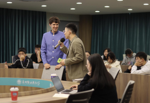 课程一开始,约翰流利的中文就给休闲体育专业的同学们一个大大的惊喜,约翰分享了他是如何通过篮球在他刚来中国,语言和环境都十分陌生的情况下,打开了与异国他乡的人们的沟通交流之路。“虽然他不会说英语,我不会说中文,但是当我们在篮球场上,我感觉我们的交流没有障碍”。约翰通过自己对篮球的热爱,开启了他对于学习中文的道路。